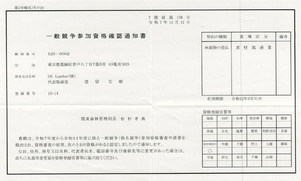 当社はこのたび、関東森林管理局より**「一般競争参加資格確認通知書」**の交付を受け、一般競争(指名競争を含む)への参加資格があることを確認いただきました。